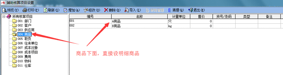 二、 在科目設置模塊,存貨類科目,如庫存商品、原材料等科目,不要掛接輔助核算項目,如下圖: