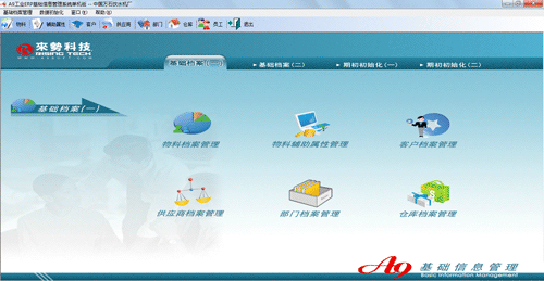 基礎信息管理系統是各項基本檔案管理、初始化數據管理的中心,檔案信息包括物料檔案、商品檔案、客戶檔案、供應商檔案、倉庫檔案、經辦人檔案等十一項檔案信息,初始化數據管理包括期初庫存初始化、期初應付賬款初始化、期初應收賬款初始化等八項初始化信息。